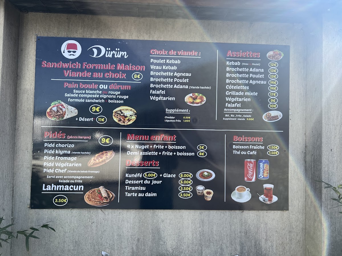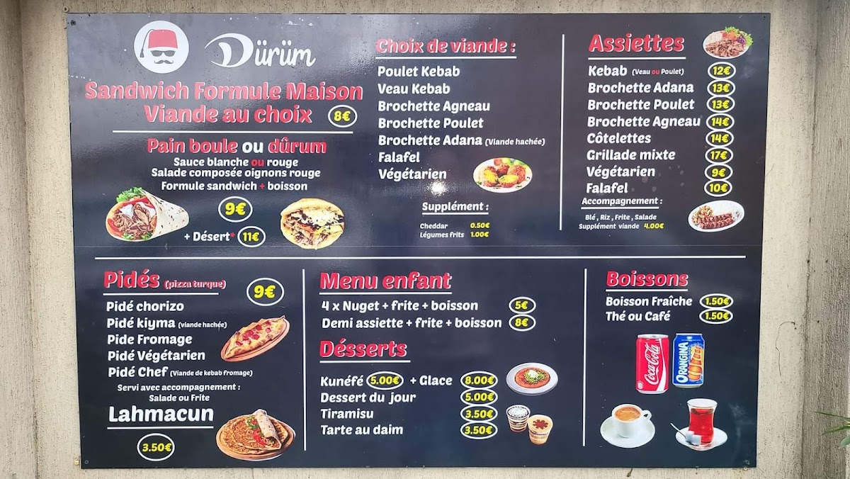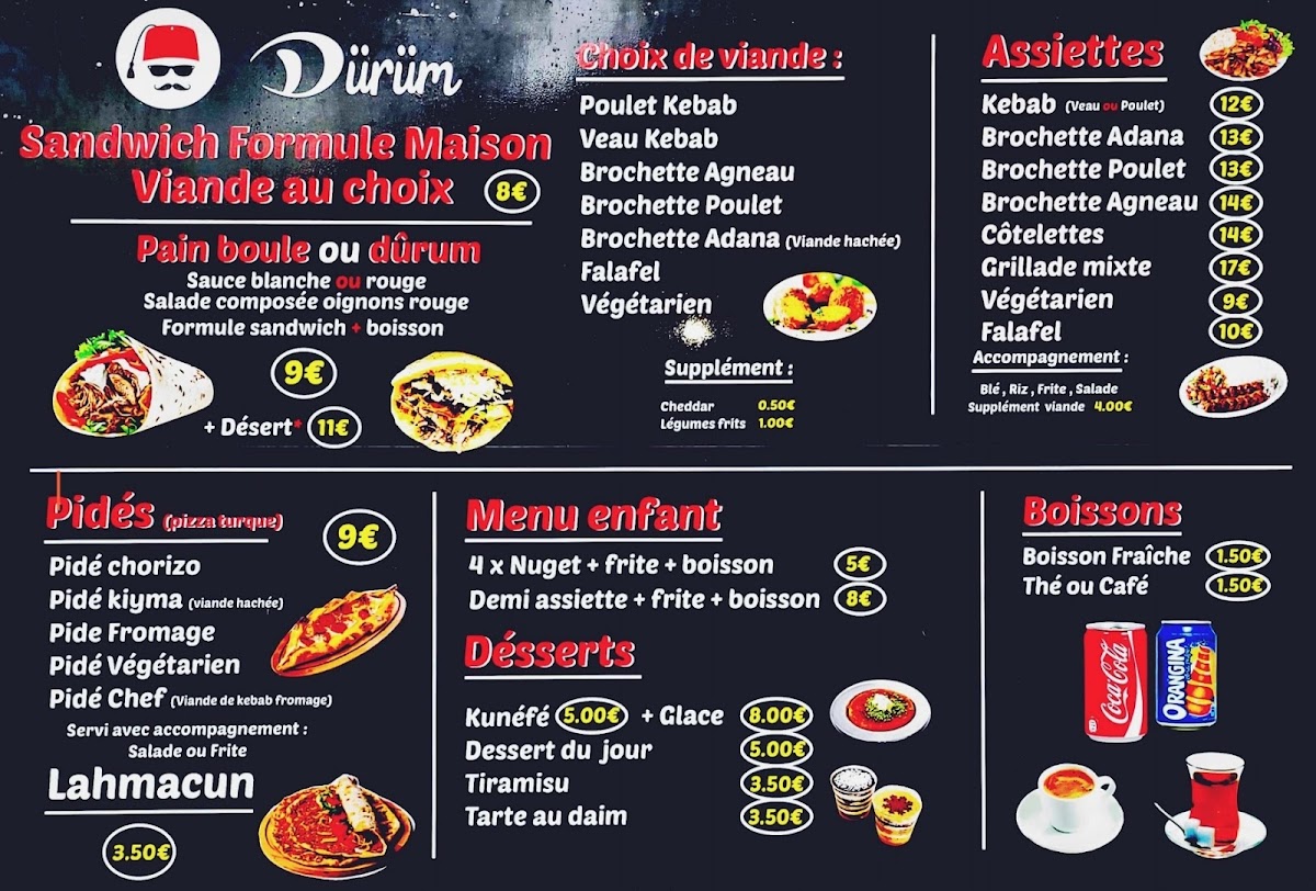 From a reviewer’s perspective, the menu at Durum Le Thillay reflects a clear focus on hearty, well-loved kebab specialties that cater to both traditional tastes and those looking for a more complete meal. The presence of Kebab Gourmet immediately suggests an elevated take on a classic favorite, appealing to customers who want richer flavors and careful preparation. For diners who prefer a plated experience, the Assiette Kebab stands out as a satisfying option, offering a more generous and balanced presentation. The menu also highlights versatility through items like Kebab Galette Complète, which combines convenience with fullness, and Pidé, known for its soft bread and comforting appeal. Adding to this variety is Lamacun, a lighter yet flavorful choice that brings a distinct touch to the overall selection. Taken together, these menu items show a concise but well-thought-out offering, emphasizing quality, familiarity, and choice, making Durum Le Thillay a reliable spot for kebab lovers seeking both simplicity and substance.